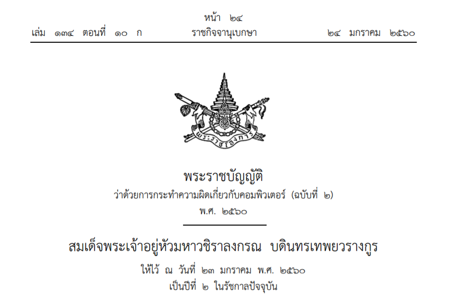 ก่อนหน้านี้ ร่างพระราชบัญญัติ ว่าด้วยการกระทําความผิดเกี่ยวกับคอมพิวเตอร์ ฉบับใหม่ ผ่านการเห็นชอบจากสภานิติบัญญัติแห่งชาติ เมื่อวันที่ 16 ธันวาคม 2559 ที่ผ่านมา ล่าสุดประกาศลงราชกิจจานุเบกษาแล้ว โดยมีชื่อว่า “พระราชบัญญัติ ว่าด้วยการกระทําความผิดเกี่ยวกับคอมพิวเตอร์ (ฉบับที่ 2) พ.ศ. 2560” ( พ.ร.บ.คอมพิวเตอร์ ปี2560)