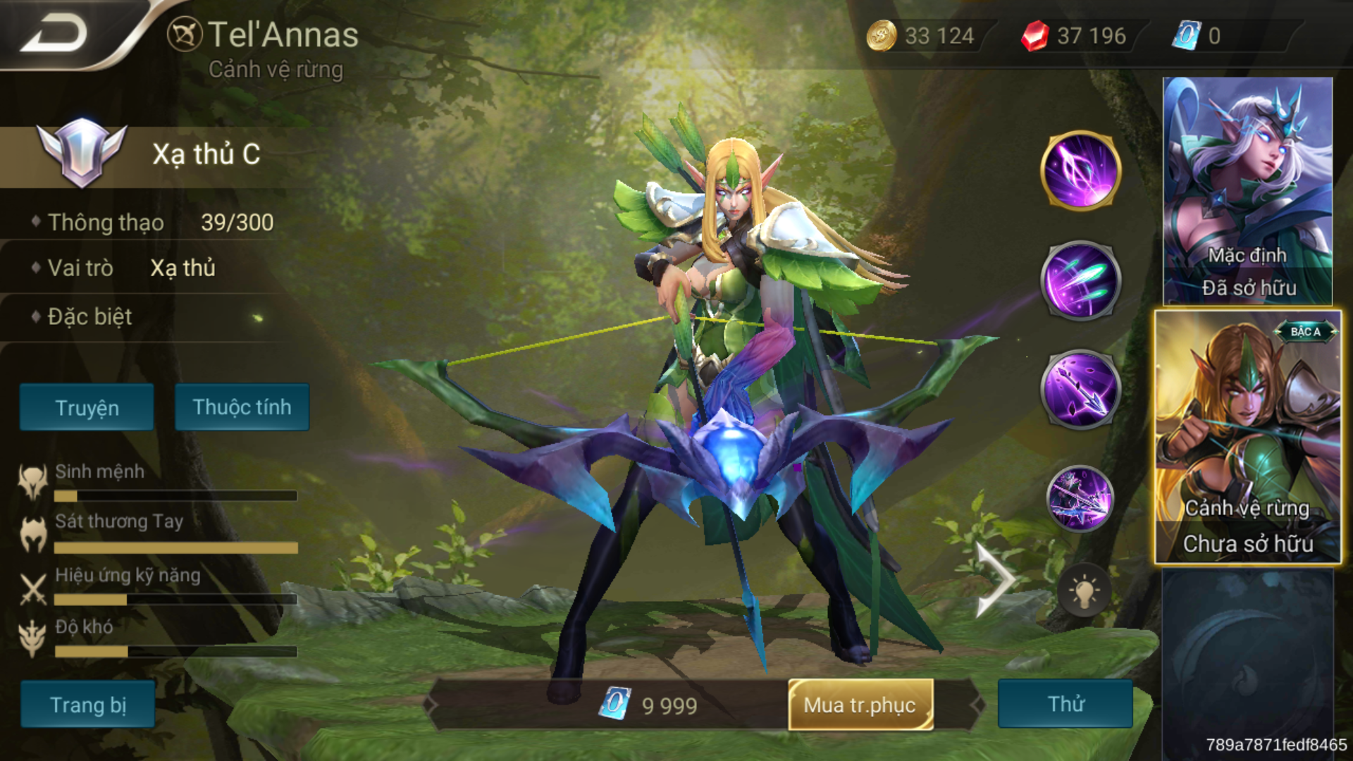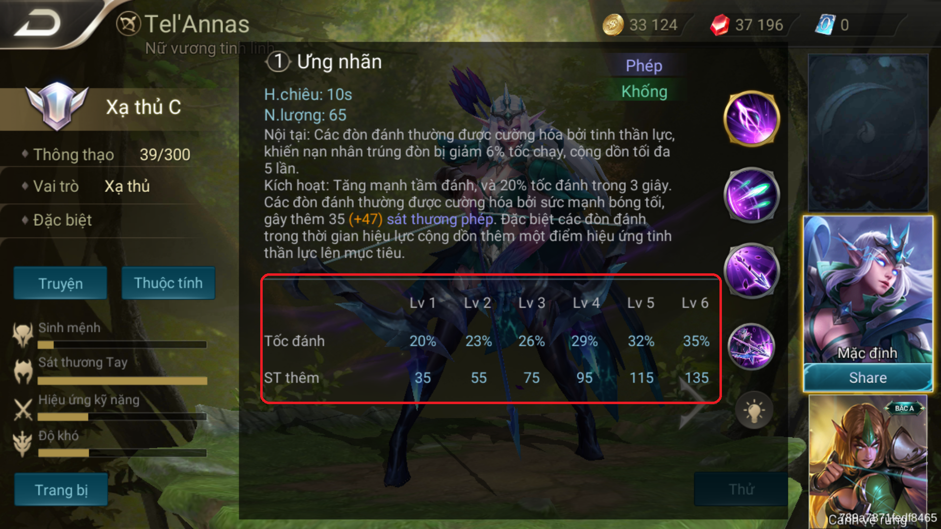 Eagle Eye : (สกิลที่ 1) > Eagle Eye : (สกิลที่ 1) > Tel’Annas เพิ่มระยะ และ ความเร็วในการโจมตีให้ตัวเอง 20%