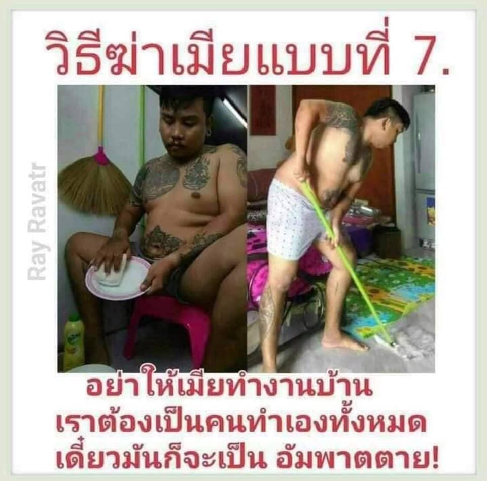 7. วิธีฆ่าเมีย : งานบ้านอย่าไปให้มันทำ เราต้องแย่งมันทำให้หมด ไม่เปิดโอกาสให้มันได้ออกกำลังกาย เดี๋ยวมันก็ไม่แข็งแรง อ้วนฉุแล้วมันก็ตายเอง