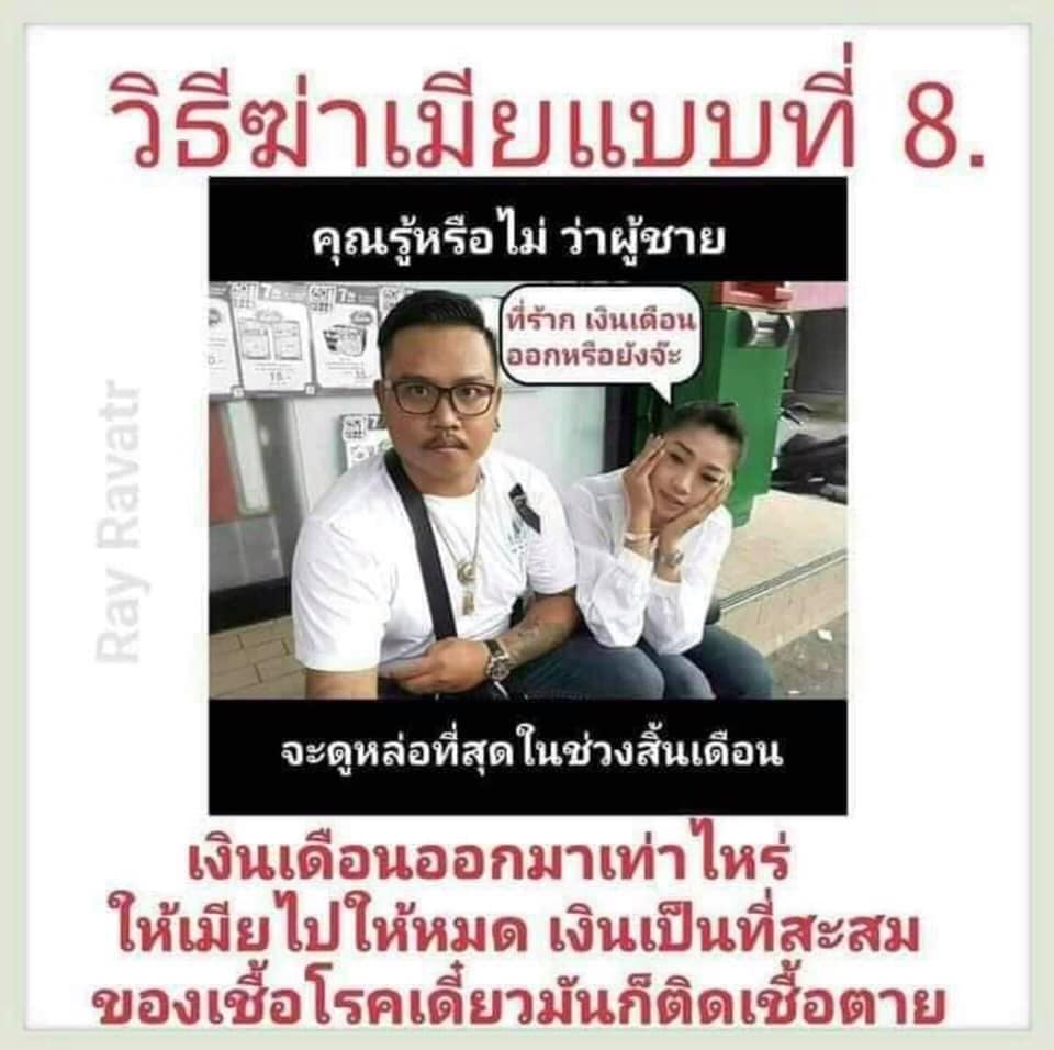 8. วิธีฆ่าเมีย : เงินเดือนออกมาเท่าไหร่ให้มันไปให้หมด ใครๆก็รู้ว่าเงินน่ะเป็นที่สะสมเชื้อโรคสารพัด เราแกล้งเอาเชื้อโรคให้มันเก็บไว้เดี๋ยวมันก็เป็นโรคตาย เราเองไม่ต้องเก็บเชื้อโรคไว้ สุขภาพแข็งแรง..เย้